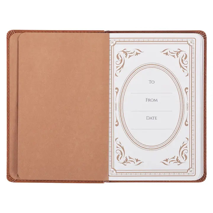 The 101 Devotions for Men Tawny Brown Faux Leather Devotional features 101 powerful devotions and supporting Scripture verses to inspire men to rely on God's strength and stand firm on the truth of His Word. Tawny brown cover with heat-debossed frame and gold-foiled text, Faux leather cover, Gold-foiled accents, Flexcover, 101 daily devotions, 128 pages, Two-color interior, Attached ribbon marker, Presentation page , Size: 7.2” x 4.8” x .6”