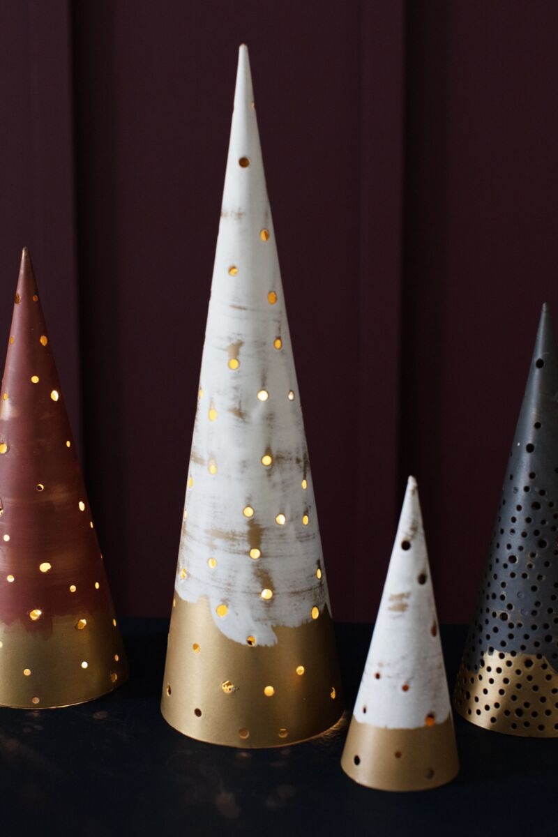 The shimmery beauty of the night sky and magical forest are captured with the Alfie Tree collection. Gold metal Christmas trees are perforated with dots from top to bottom and are painted with subdued holiday colors. Place a flameless candle, tealight, or battery powered string lights beneath the cones for a warm and wintry glow.