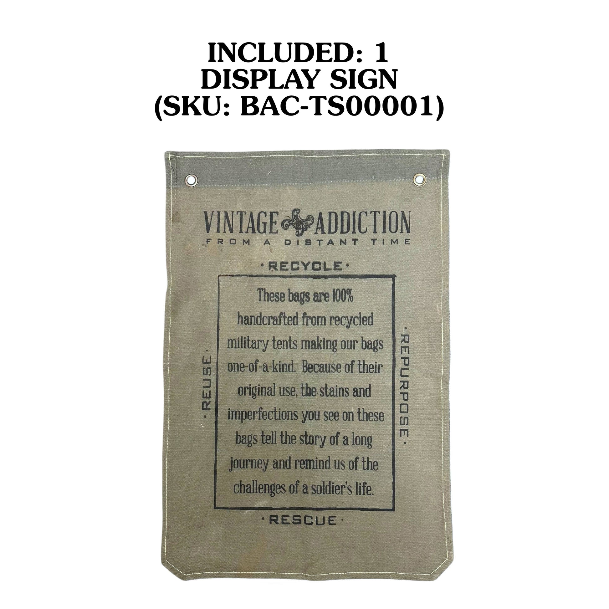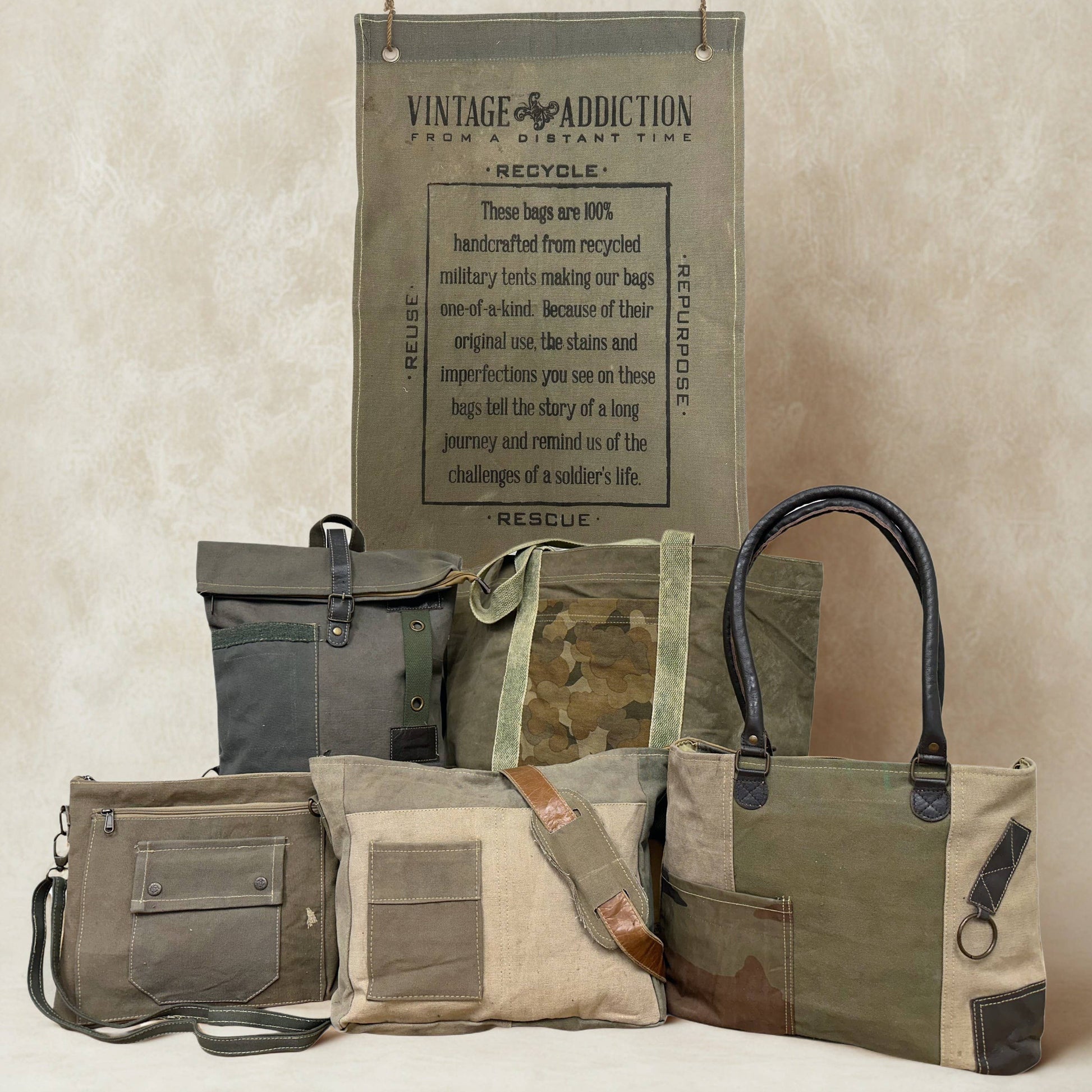 Our eco-friendly large tote is handcrafted with recycled military tent fabric and accented with repurposed camouflage. It has an open top, 1 outside pocket, 1 interior pocket, and is fully lined. DISCLAIMER: Our recycled military tent bags are a tribute to & a reminder of the sacrifices & contributions of military veterans. Please know that these bags are made from authentic used military tents and are not new canvas packaged as recycled tents or tarps. THESE ARE THE REAL DEAL!! As a result, the tent material will show signs of worn-like imperfections which add to its character. Each bag has differences in genuine imperfections, stains, and colors. Your bag will be as unique as each soldier's experience when seeking shelter in these tents whether in the training field or in a combat zone. All Camo prints will vary in color & prints, some will have foliage as in shown photos. No 2 alike. All Sales Final. Dimensions: 26"W x 15"H x 7"D. Distressed green cotton webbing strap 12" drop.
