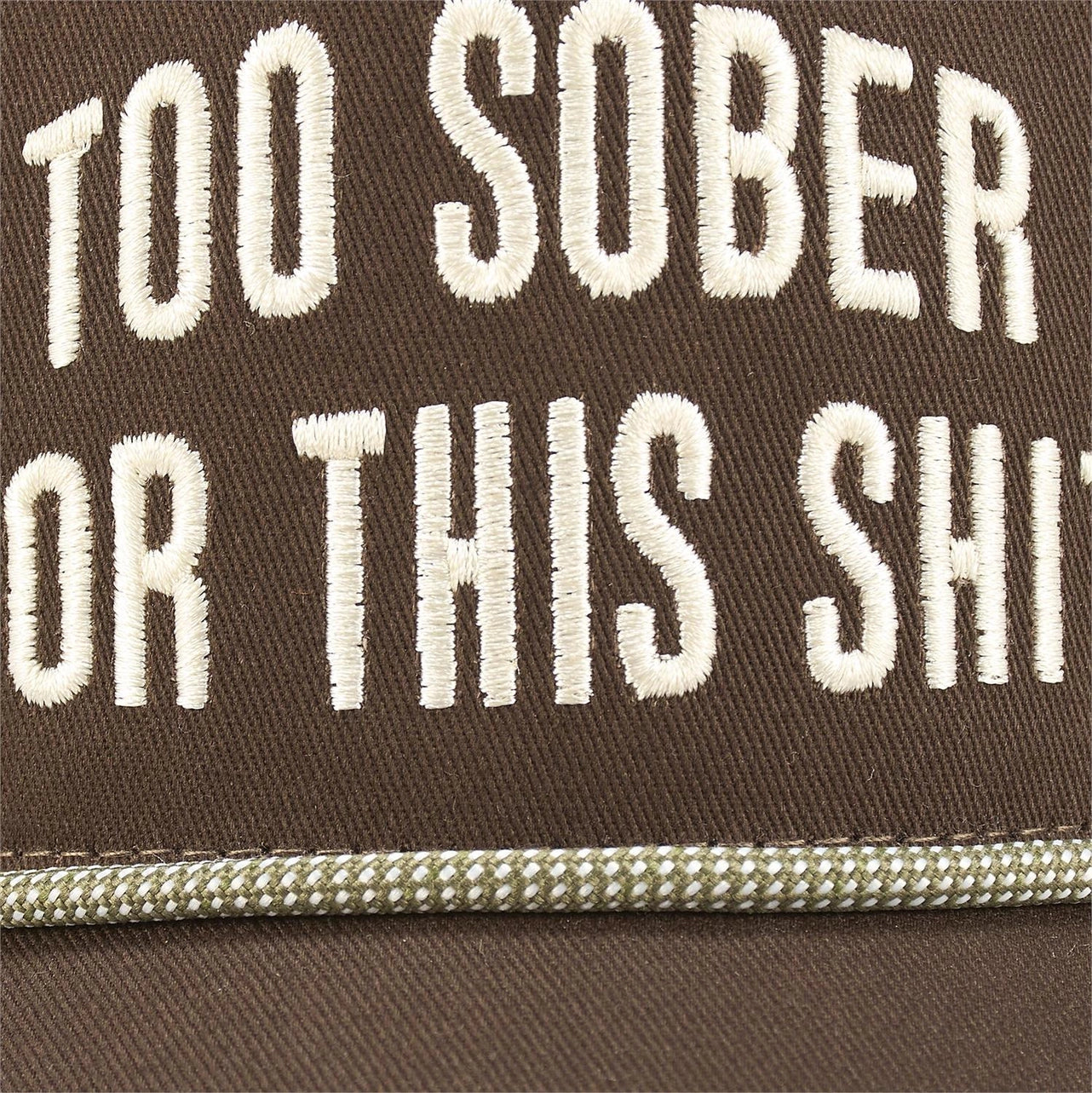 Give anyone that steps into personal space a vibe check with this trucker hat displaying a relatable sentiment that reads "Too Sober For This Shit" in an earthy style. This down-to-earth design is embroidered on brown cotton for eye-catching dimension with a coordinating grassy green cording accent. Questionables trucker hats are one size fits most with an adjustable snap closure to create the perfect fit and feature a full mesh back for comfort and breathability in hot weather. Hand wash only. Our Too Sober trucker hat puts out chill vibes making it perfect for everyday expression.