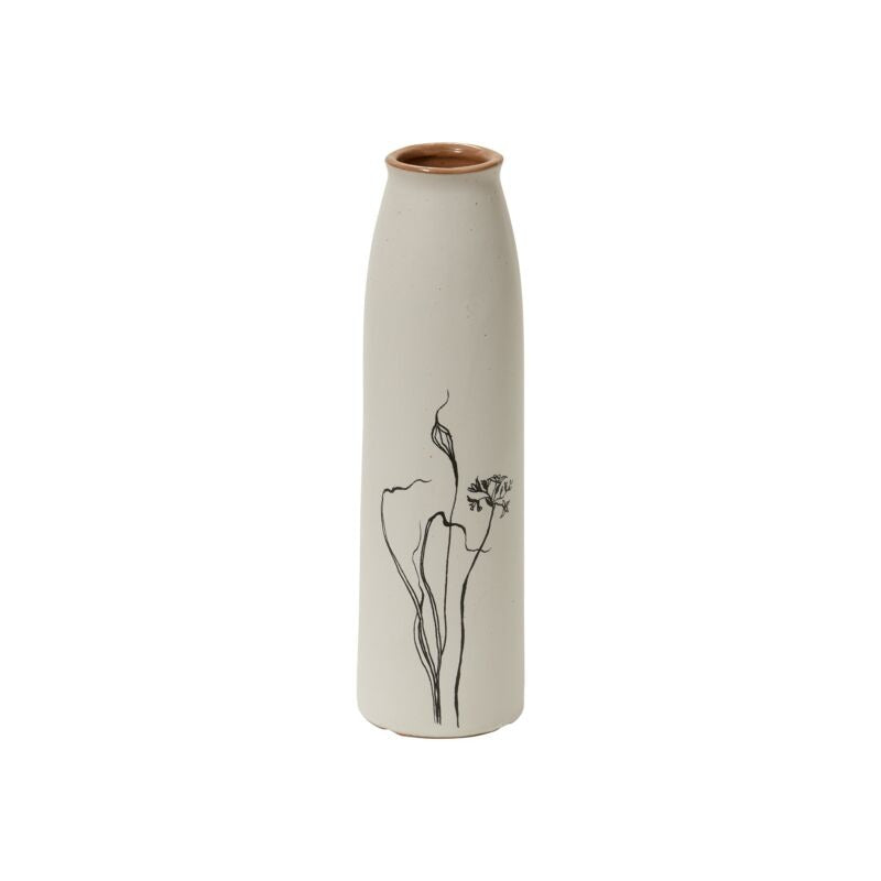 Featuring exclusive designs from artist Jessica Heimstra, the Wisteria Vase features a sleek silhouette with a rolled lip. Each piece in the collection is twice fired with a matte white speckled glaze for a modern piece celebrating the beauty of wildflowers.